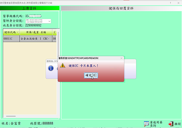 執行查詢作業時需同時置入個案健保卡及醫事人員卡!若不符合要求時會跳出訊息