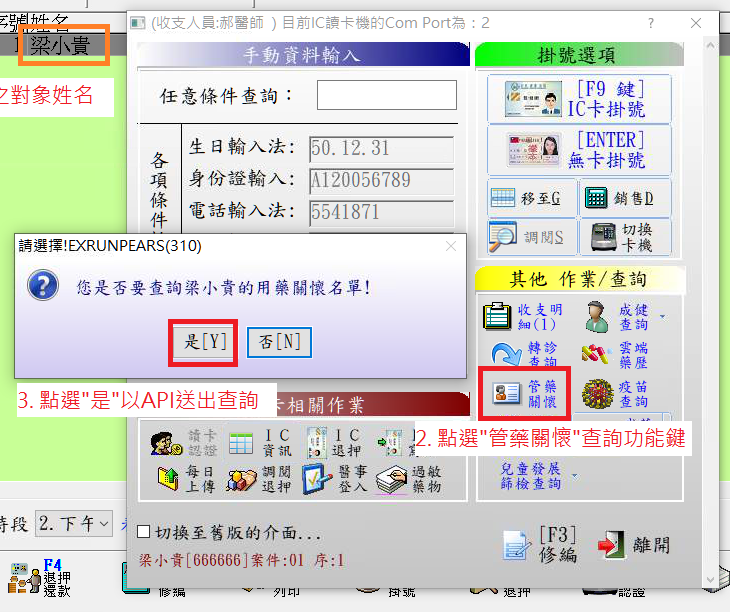 執行查詢作業時需同時置入個案健保卡及醫事人員卡!若不符合要求時會跳出訊息