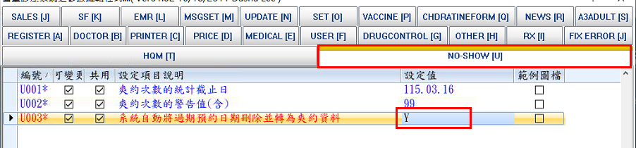 於上方點選參數標籤「NO-SHOW [U]」於下方尋找 編號 U003