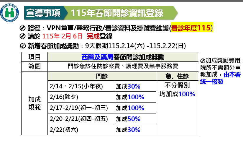 醫療院所須於115年2月6日(五)前至本署健保資訊網服務系統(VPN)登錄春節開診時段資訊(路徑:首頁/醫務行政/看診資料及掛號費維護、時段:115年除夕及春節假期),未填報者不予撥付本方案獎勵金。