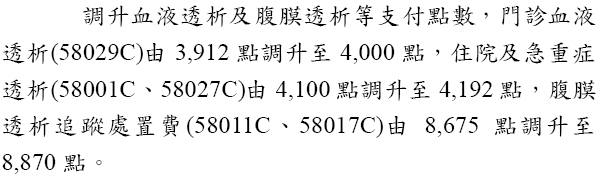 (2)修正58001C「血液透析(一次)—住院」等五項透析治療費,調升支付點數及支付規範。