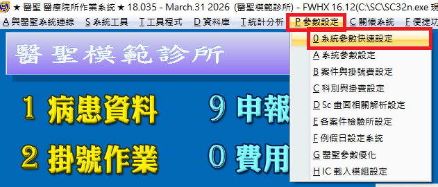於醫聖門診系統主畫面上方工具列點選「P參數設定」的「系統參數快速設定」進入