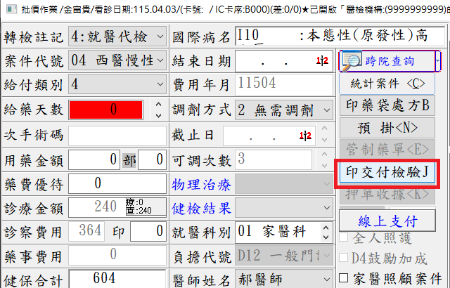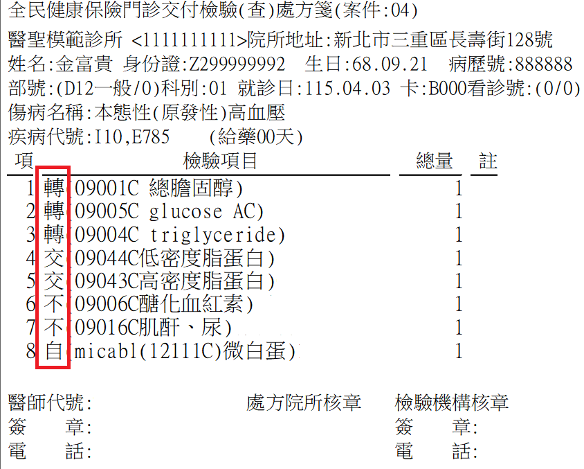 - 交付檢驗處方簽列印的類別(A)檢查(B)治療=A(設定值為A或B或AB)